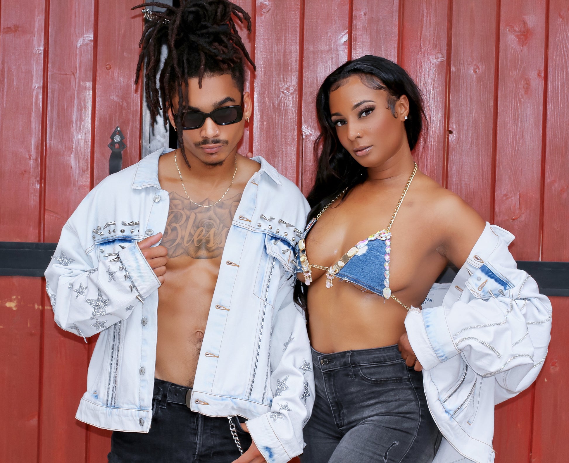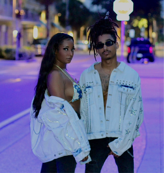 This 2 jacket set is designed for you to shine with your lover. The masculine piece is adorned with diamond stars cover both sleeves. Lots of spiked and chained with silver trim. The feminine piece is covered with a diamond designed sleeve. It’s spiked out and complete with silver trim. Both pieces share a matching silver chain design down the back center of jacket .