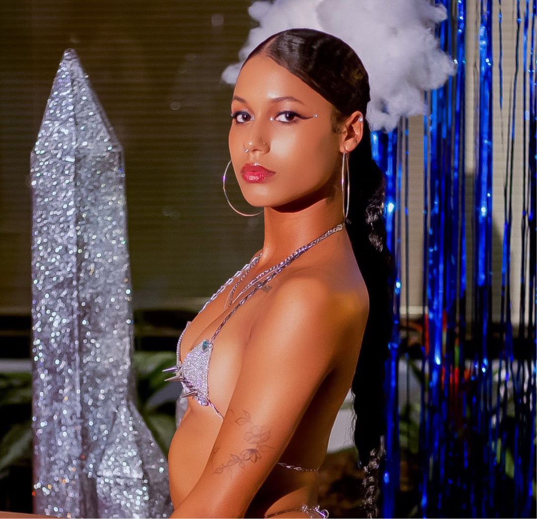 Diamond bikini bra outlined with fluorescent jewelry and spikes!